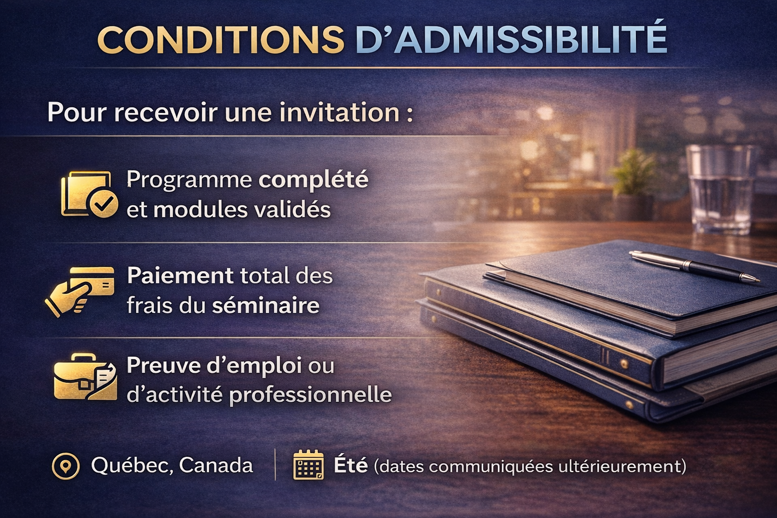 La lettre garantit-elle le visa ? Non. Le séminaire est-il obligatoire ? Non, optionnel. Est-ce une formation académique au Canada ? Non, événement professionnel. Puis-je être refusé ? Oui, IRCC décide selon votre profil.